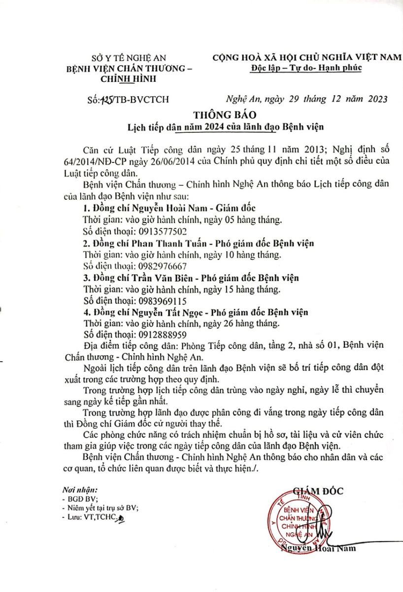 Bệnh viện Chấn thương - Chỉnh hình Nghệ An thông báo về lịch tiếp dân năm 2024 như sau: